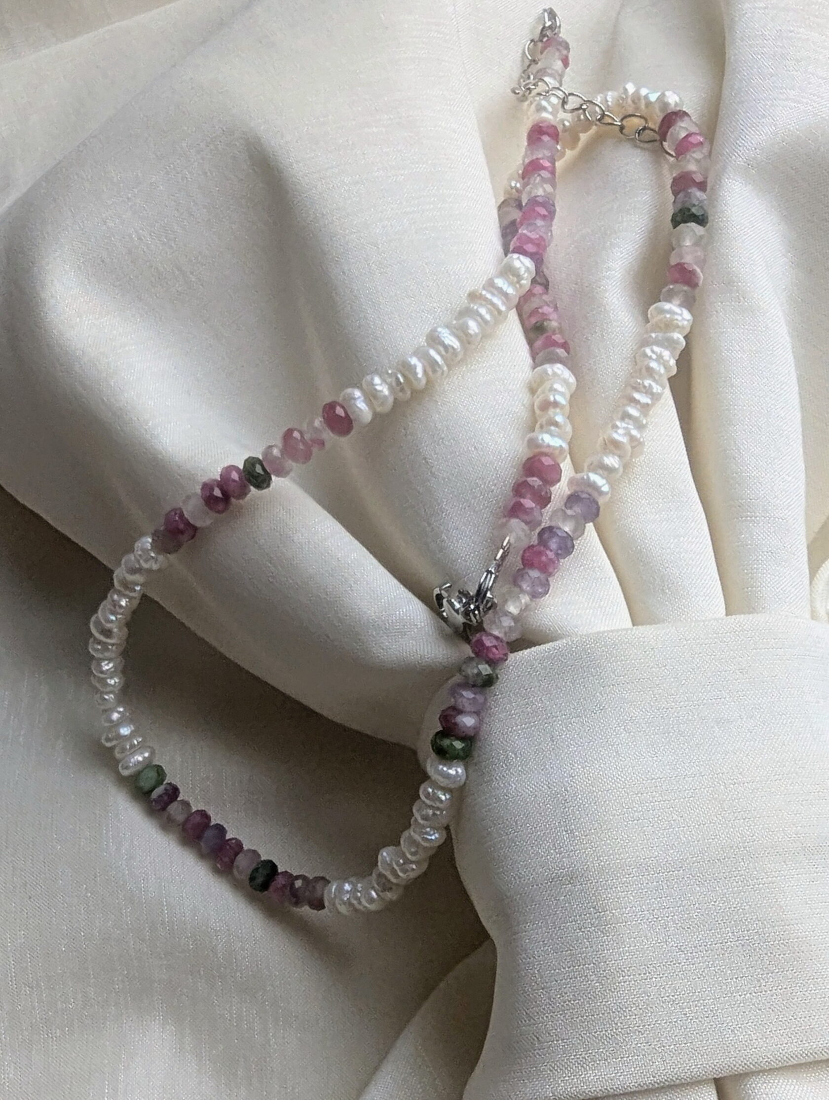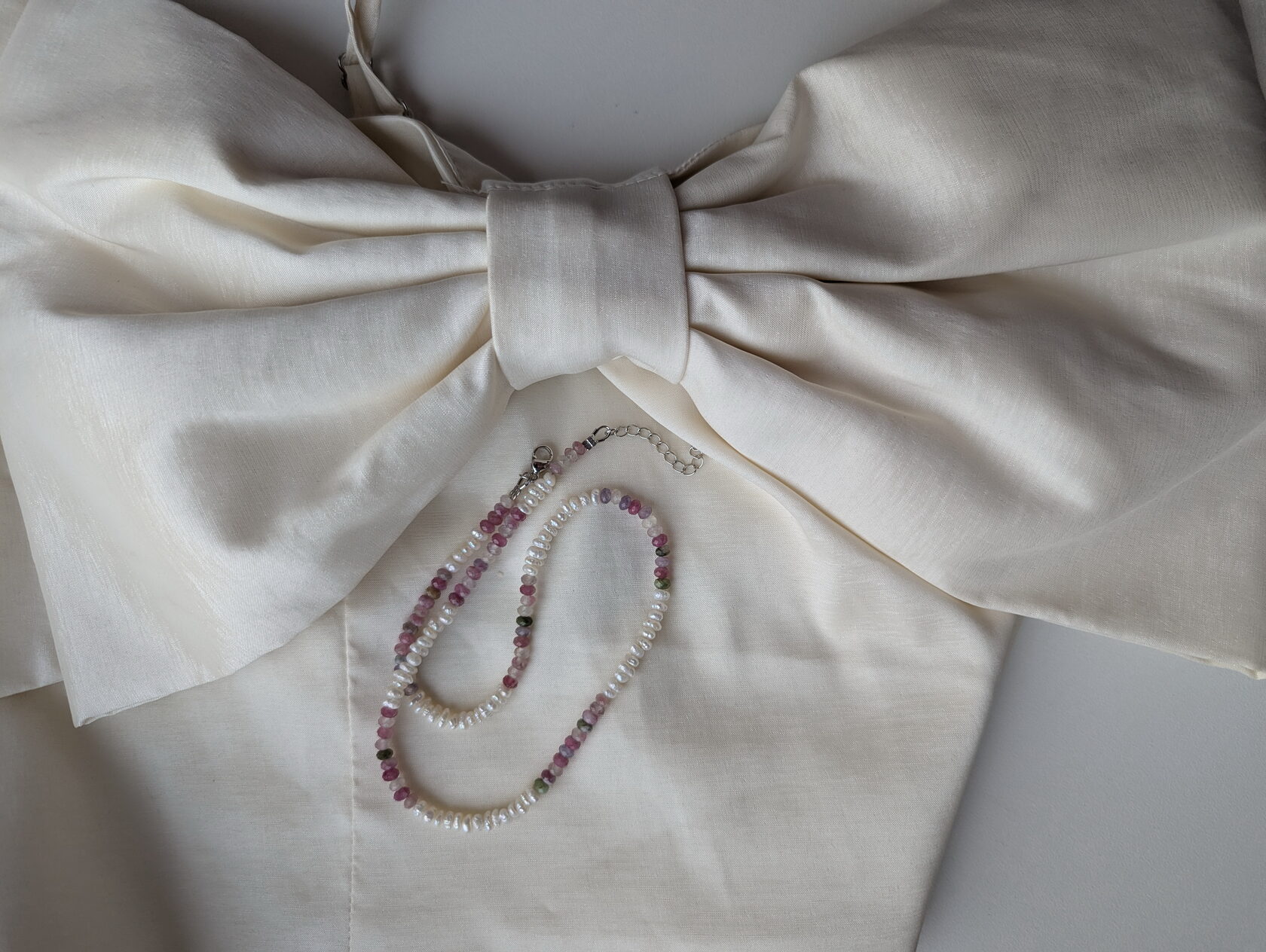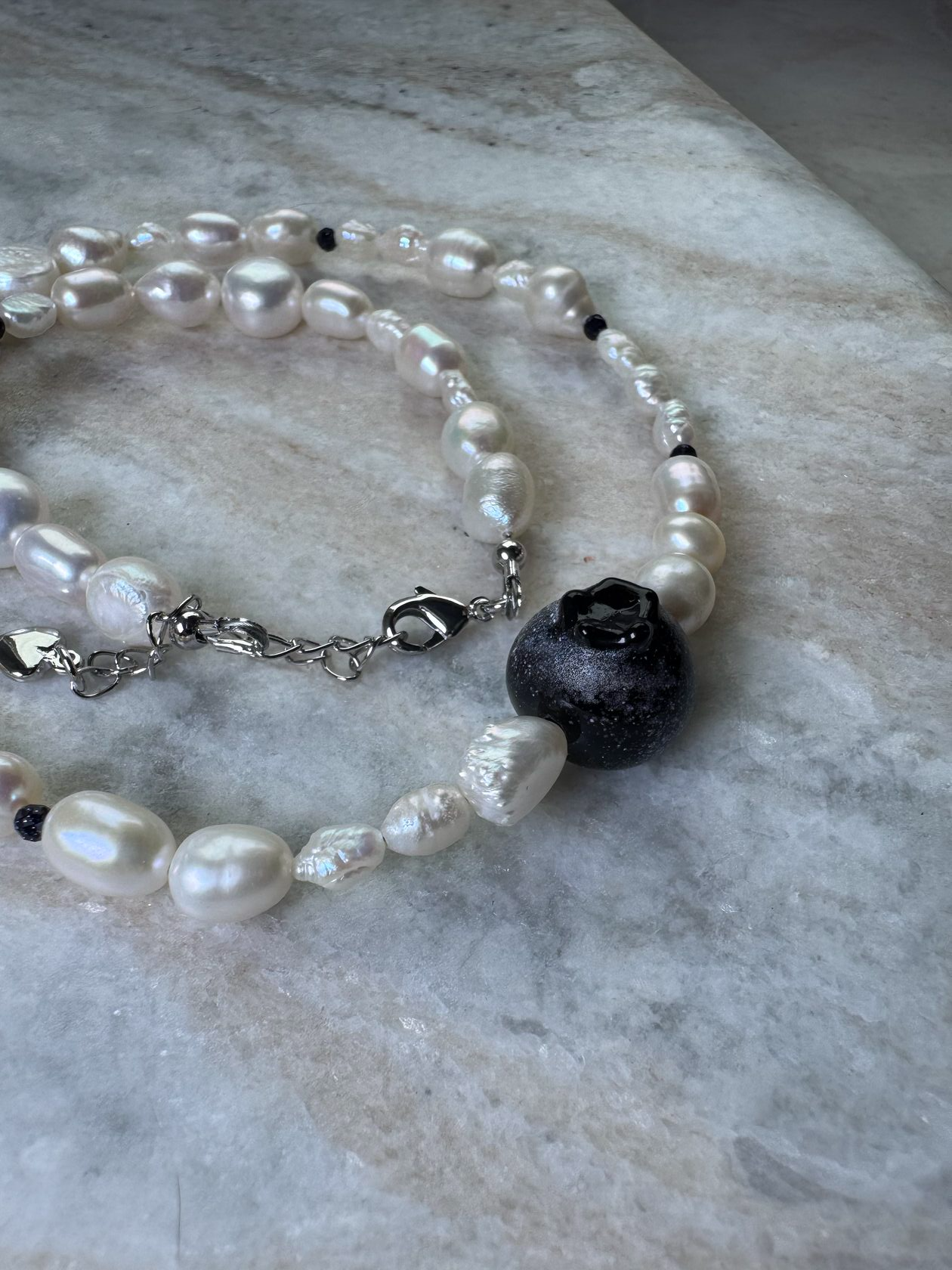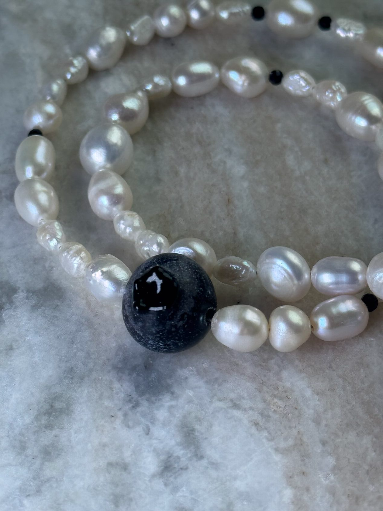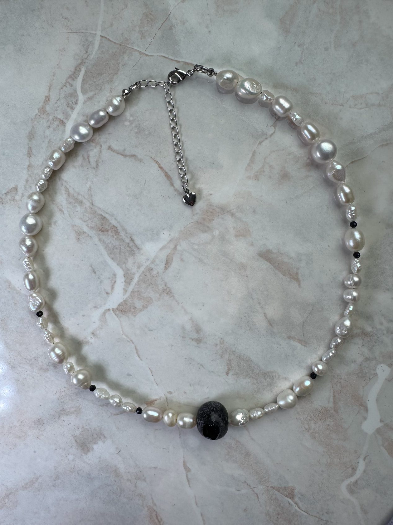 Двусторонняя бусина с натуральным белым и черным жемчугом в сочетании с жемчугом и турмалином свободной формы, повторяющим форму и цвет жемуга в бусине.
