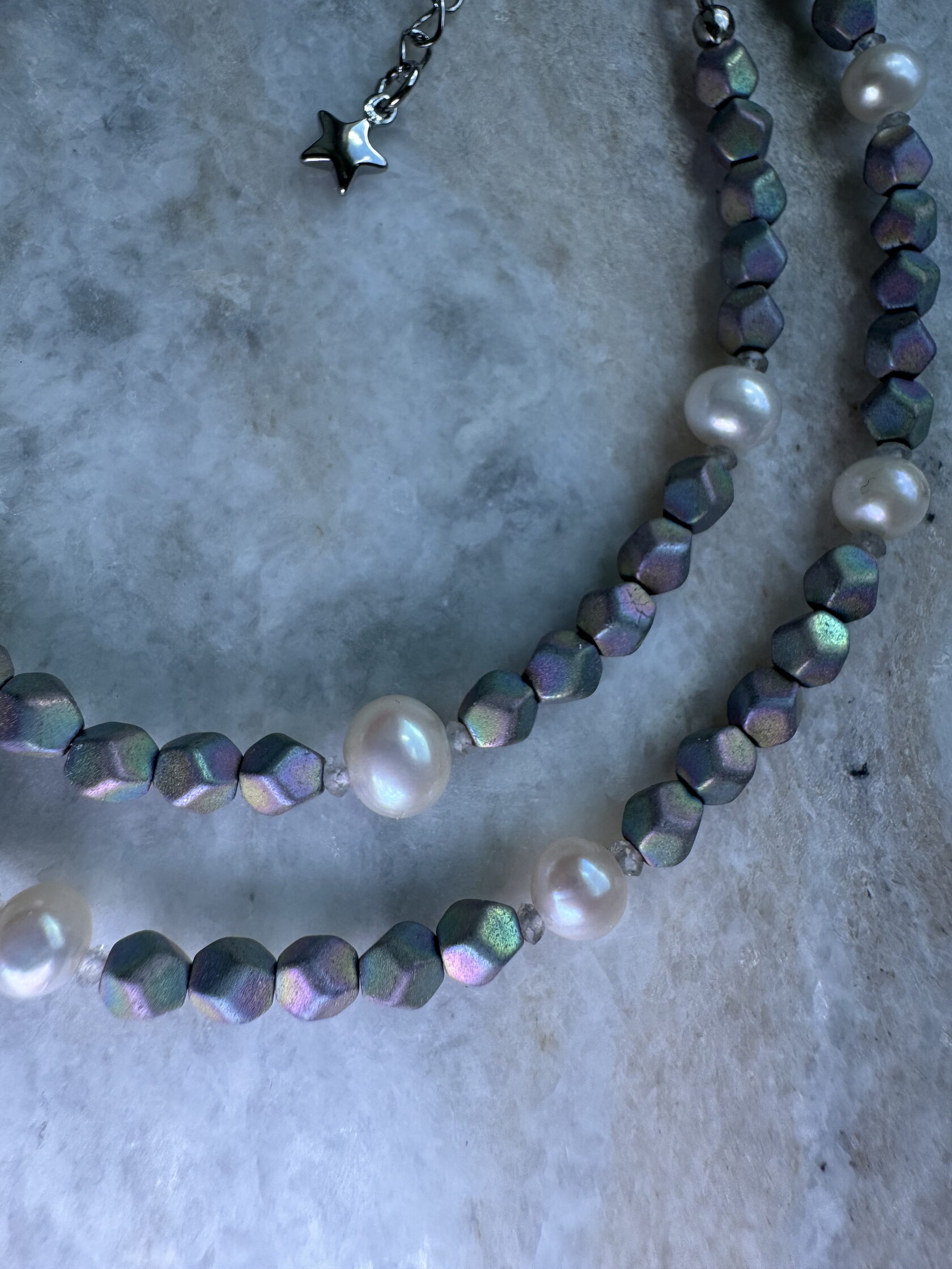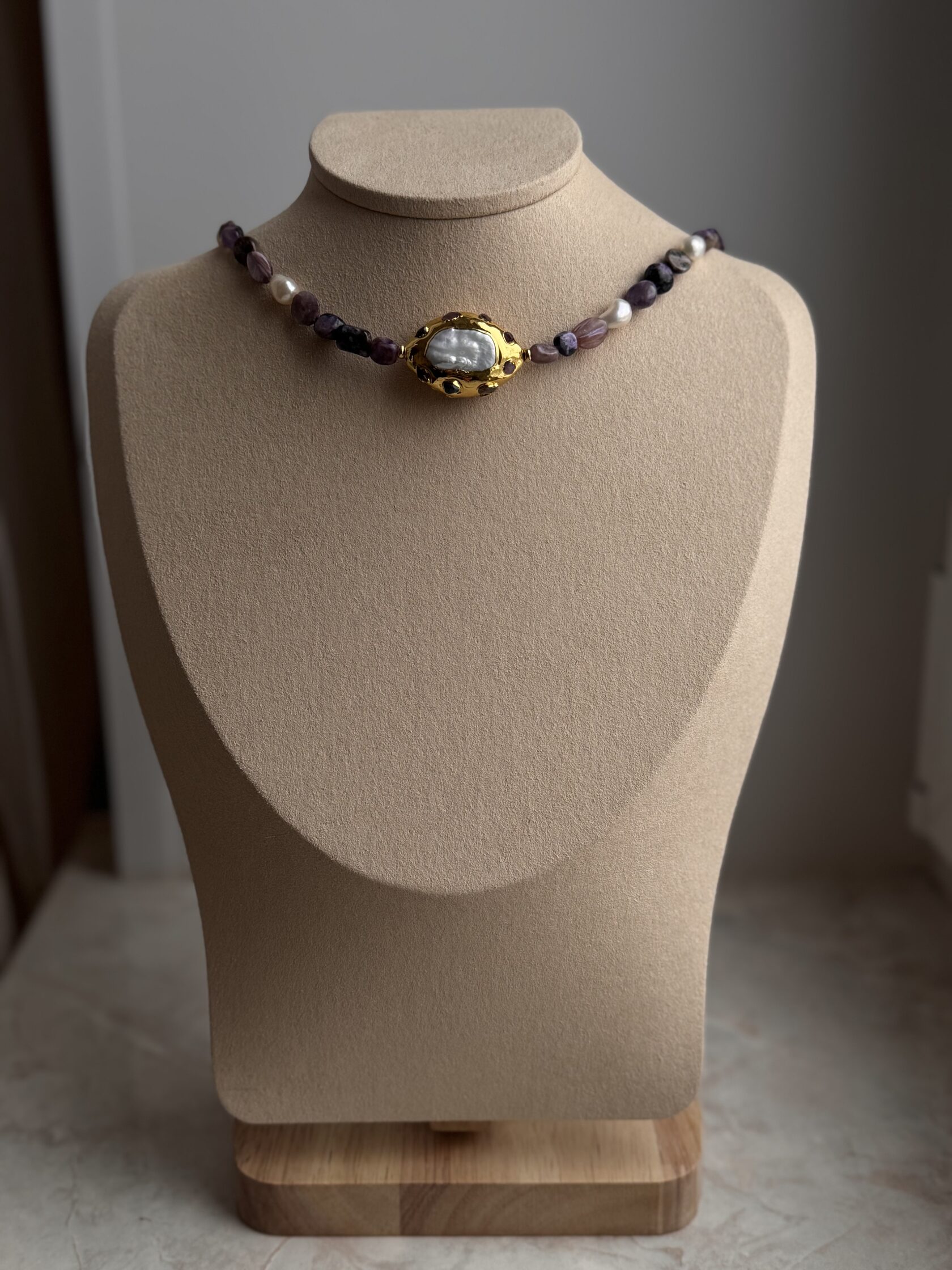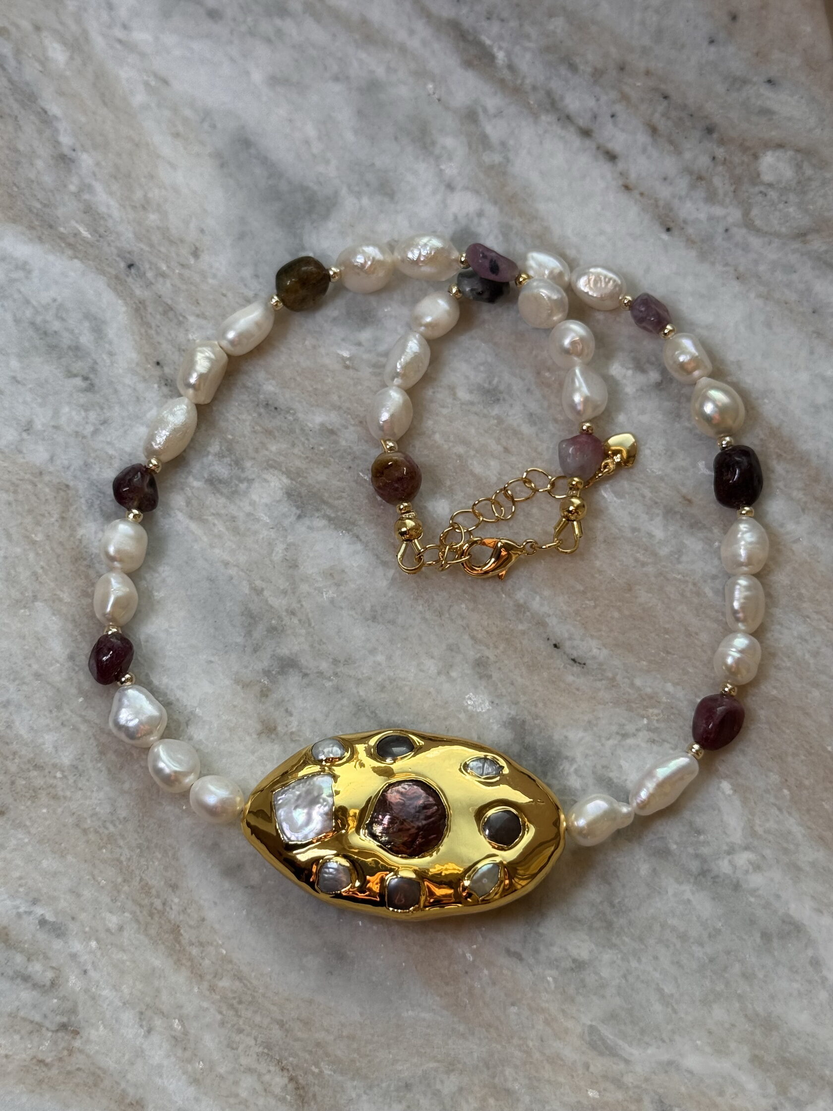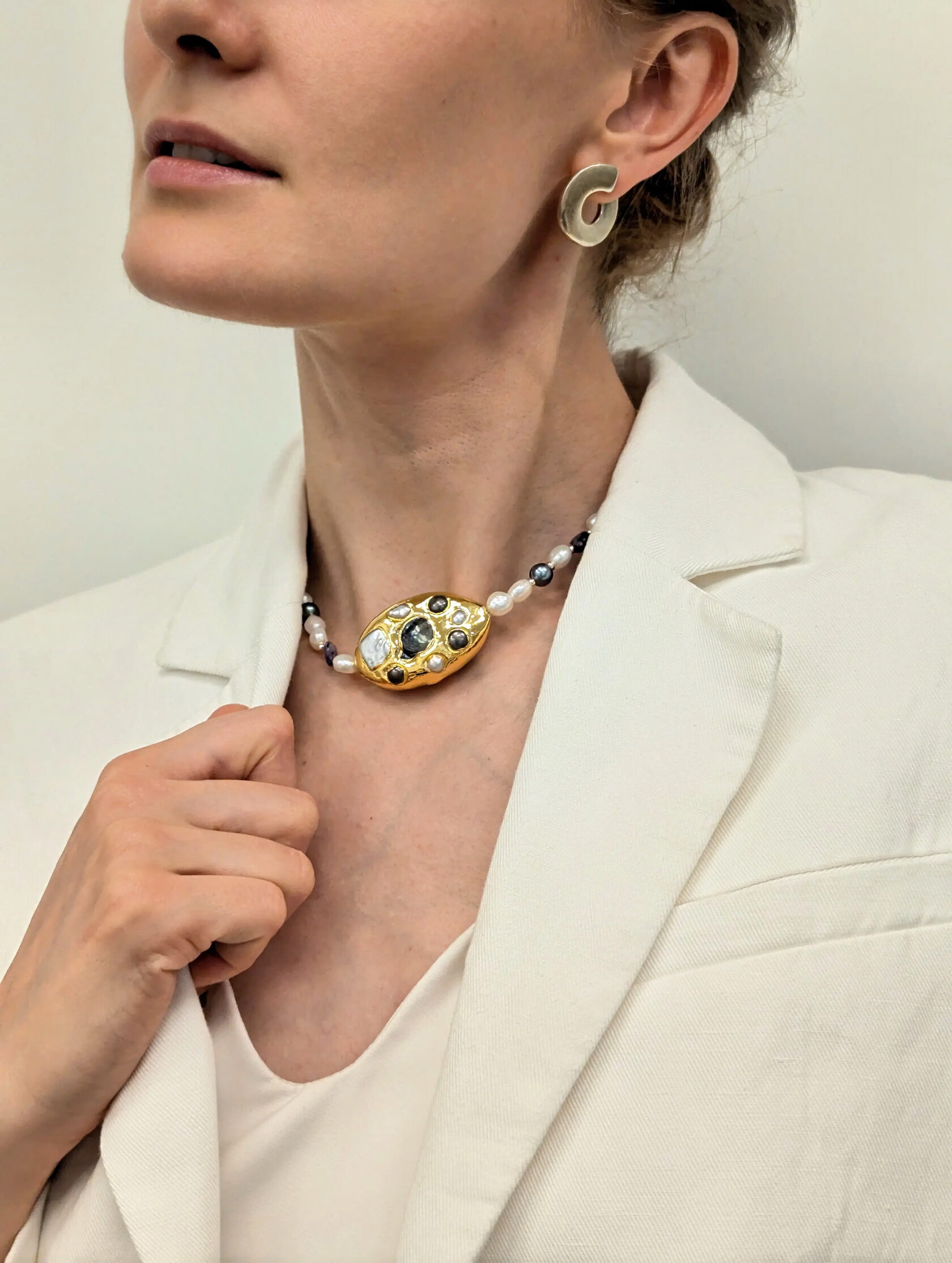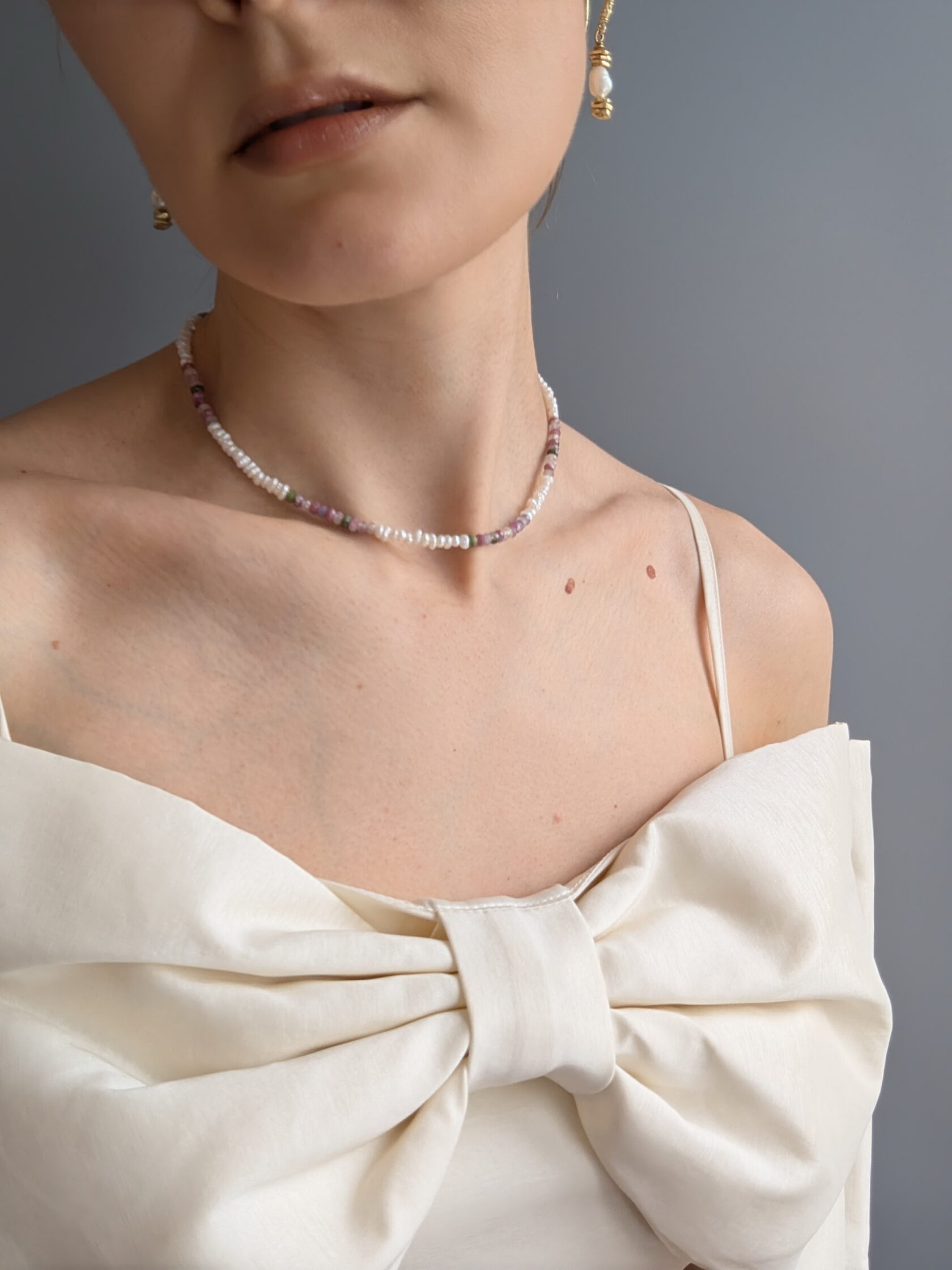 Двусторонняя бусина с натуральным белым и черным жемчугом в сочетании с жемчугом и турмалином свободной формы, повторяющим форму и цвет жемуга в бусине.
