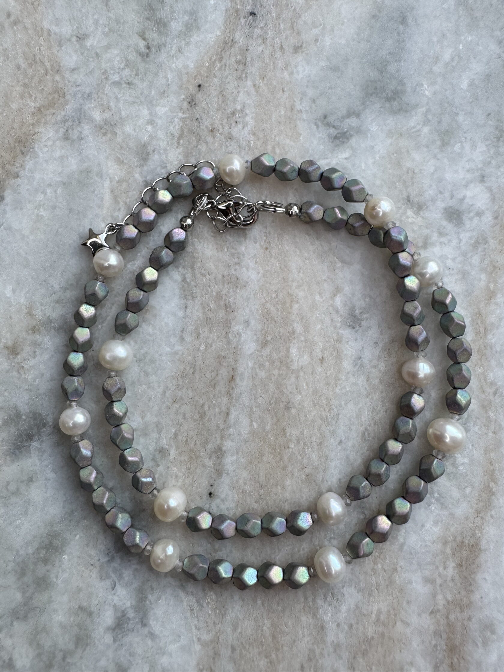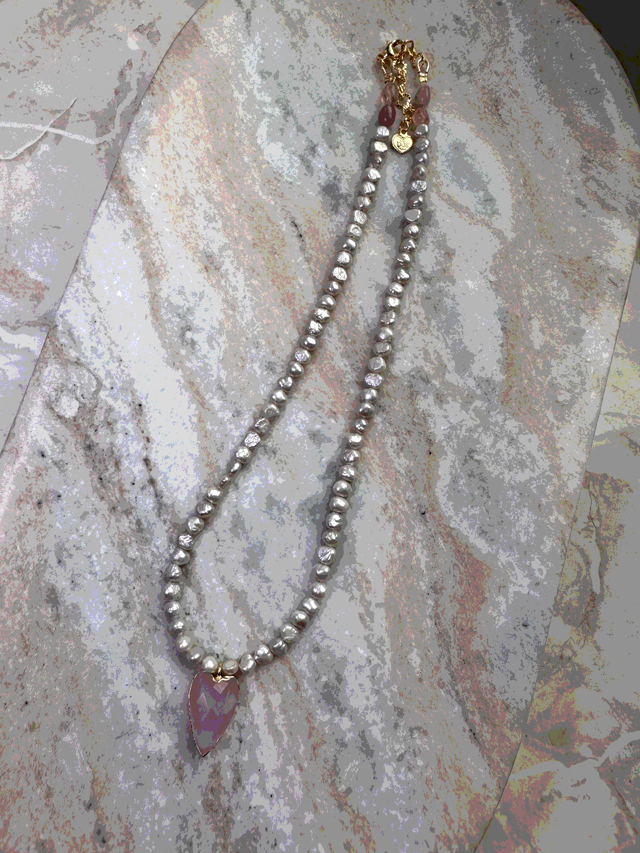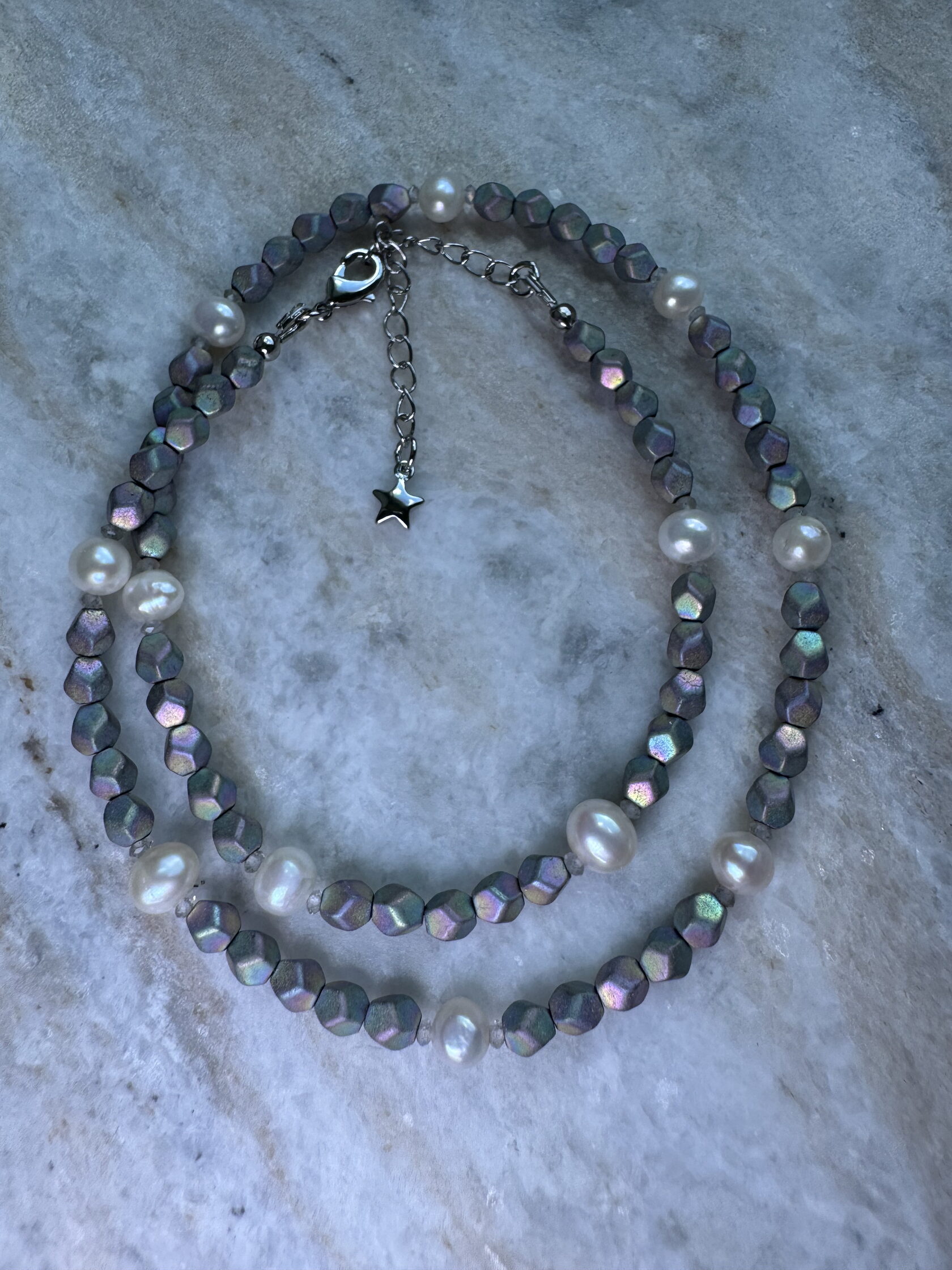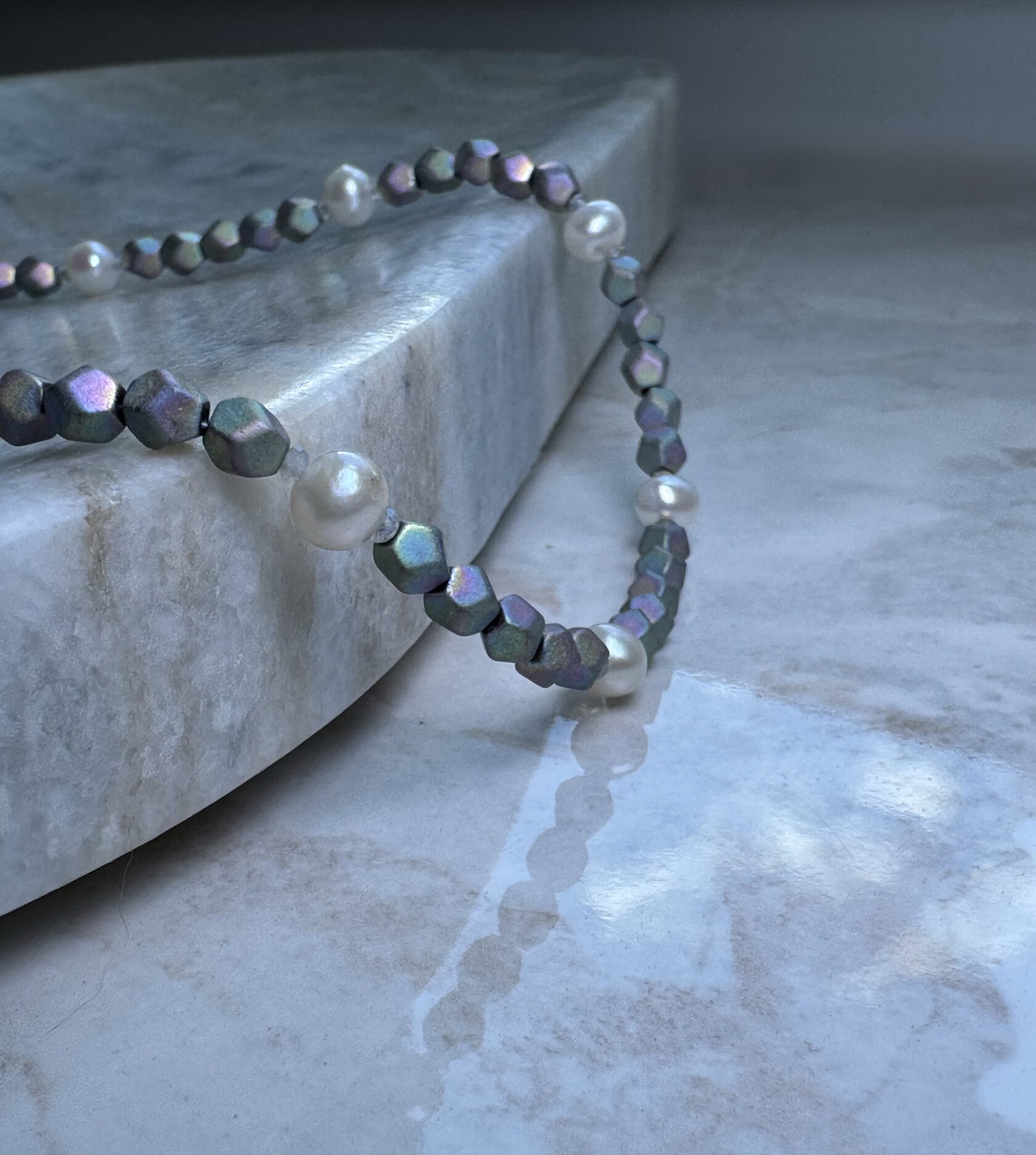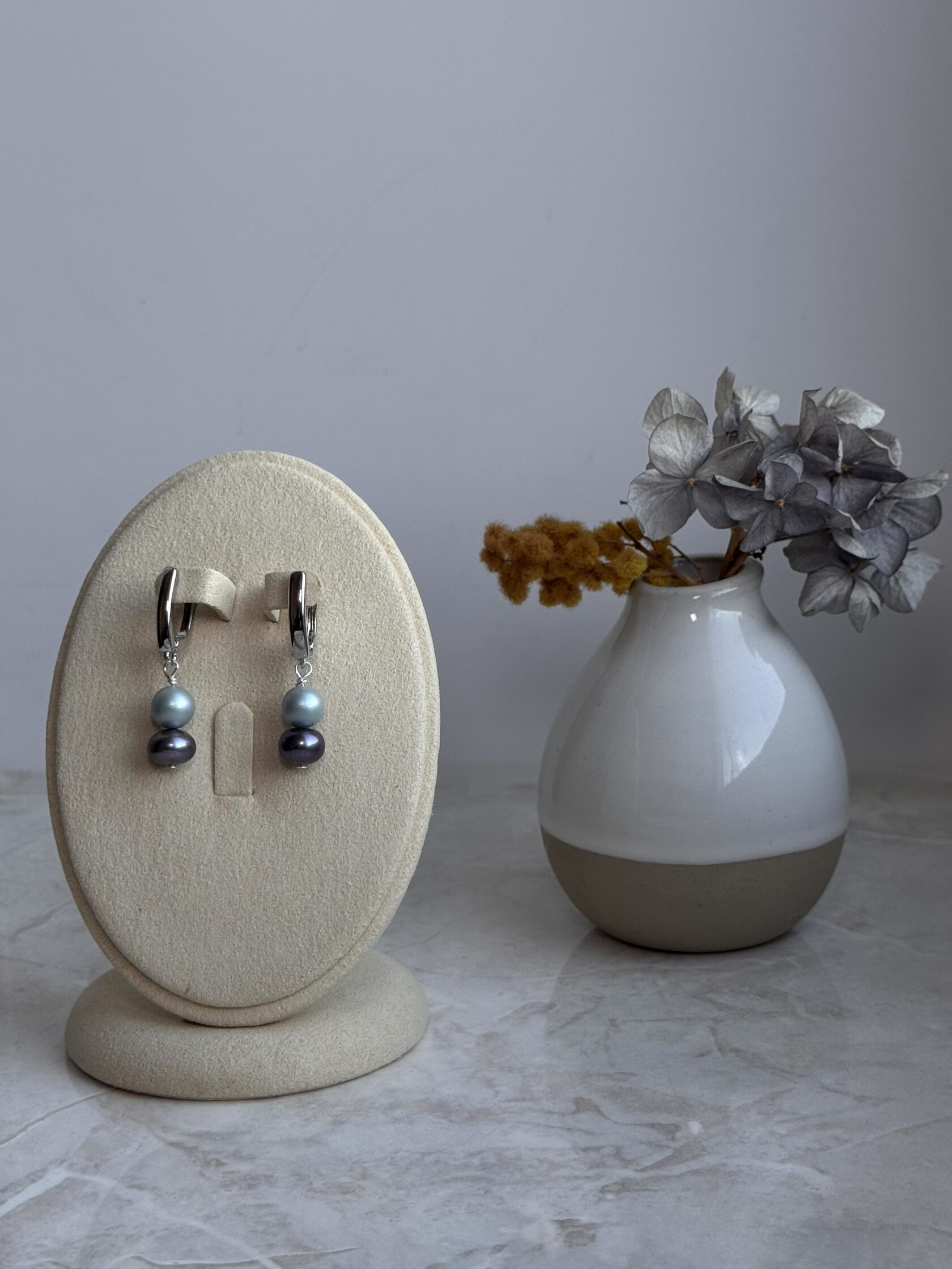 Двусторонняя бусина с натуральным белым и черным жемчугом в сочетании с жемчугом и турмалином свободной формы, повторяющим форму и цвет жемуга в бусине.