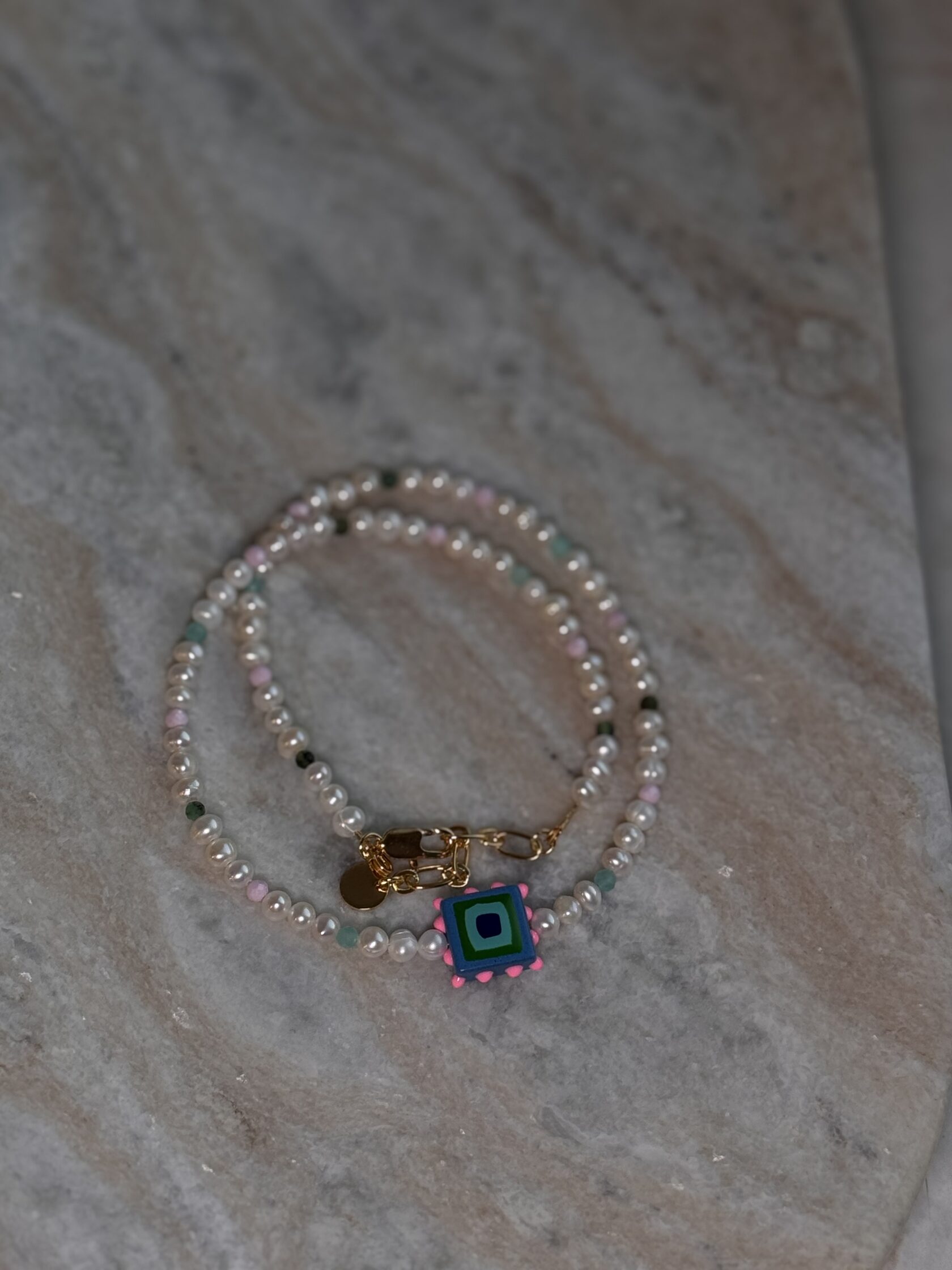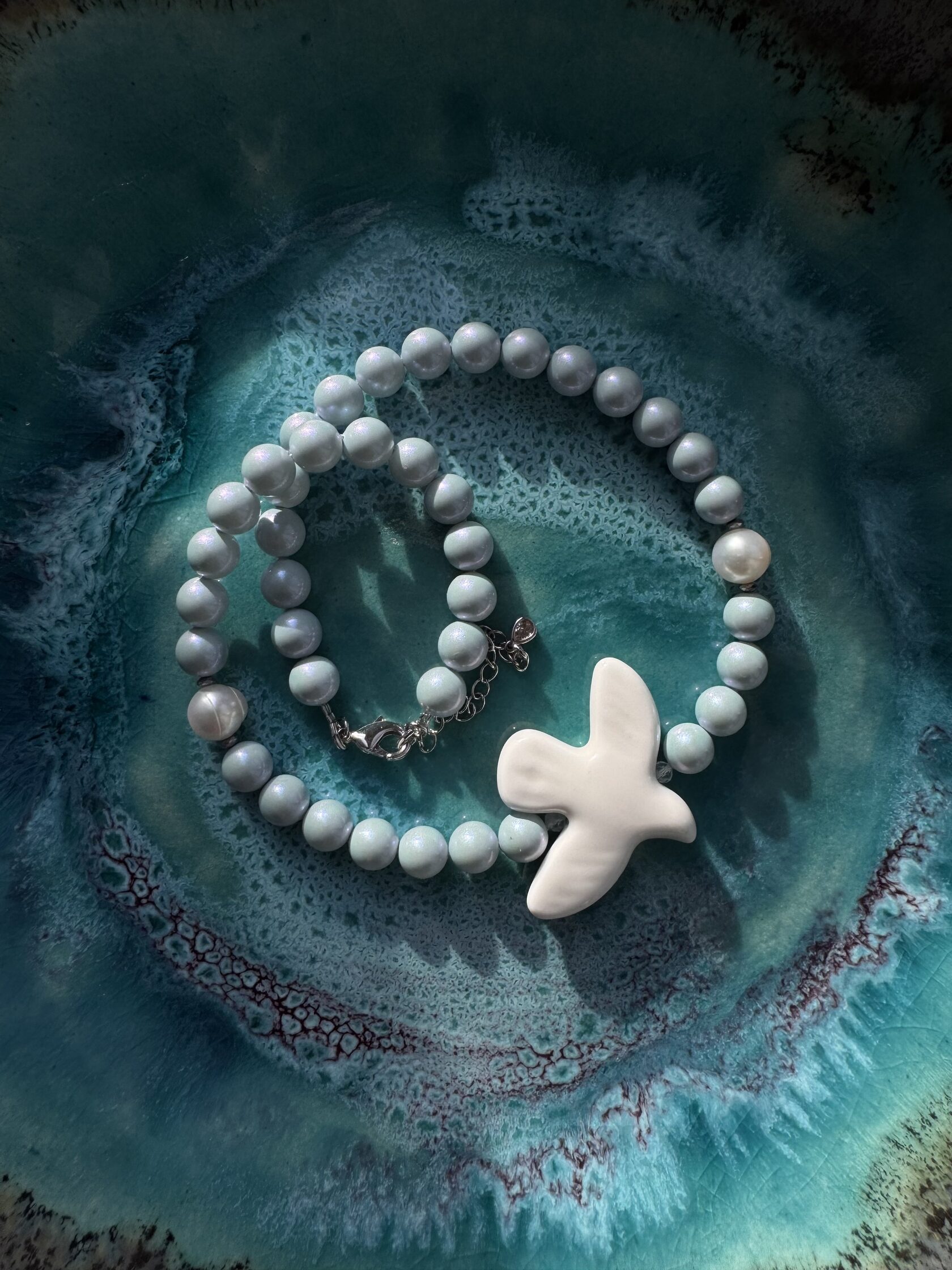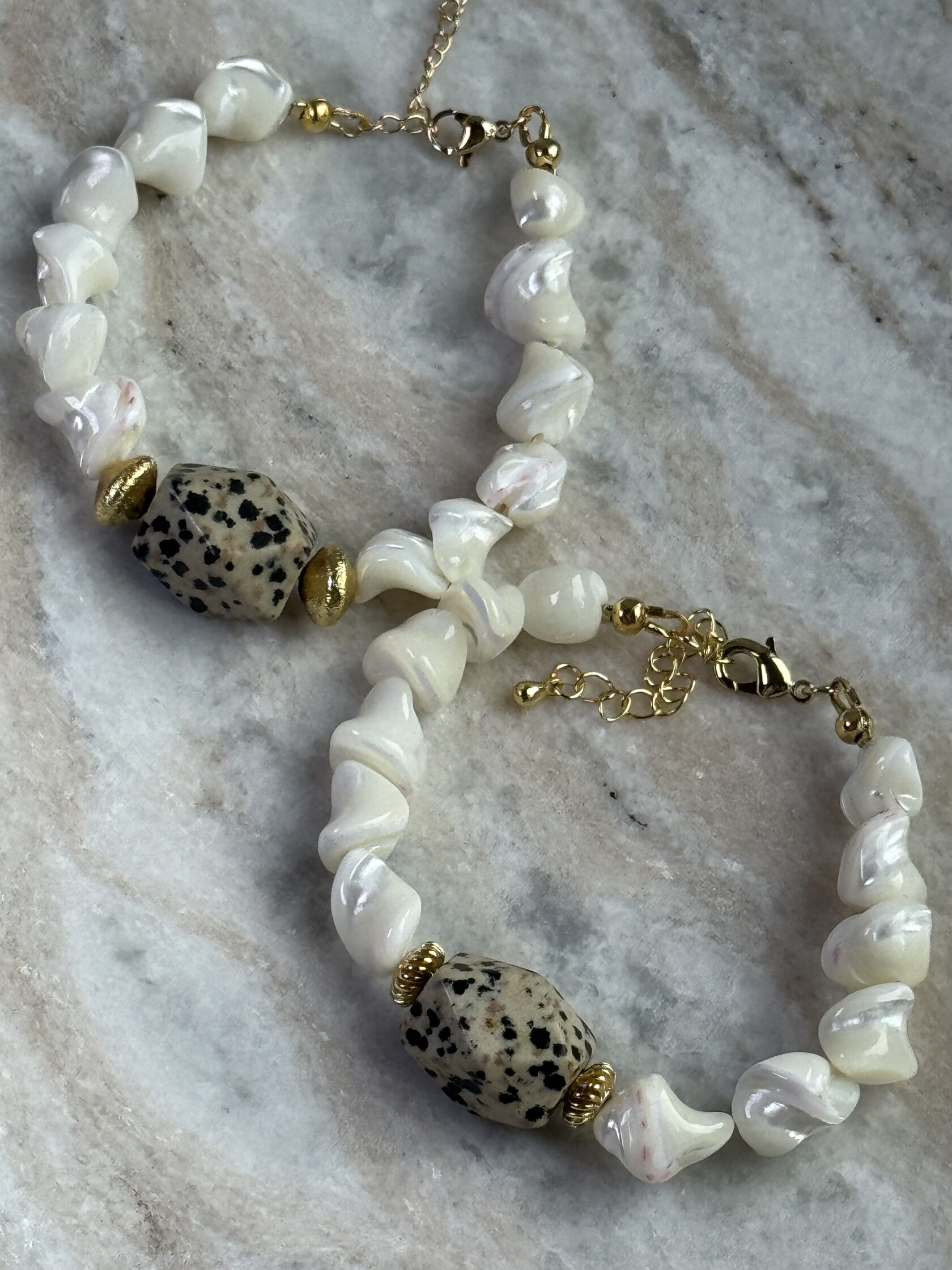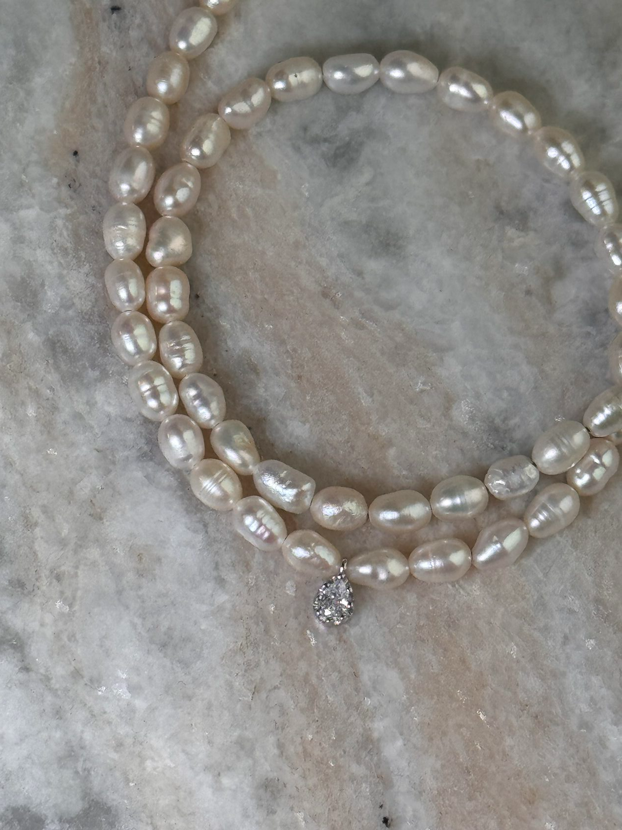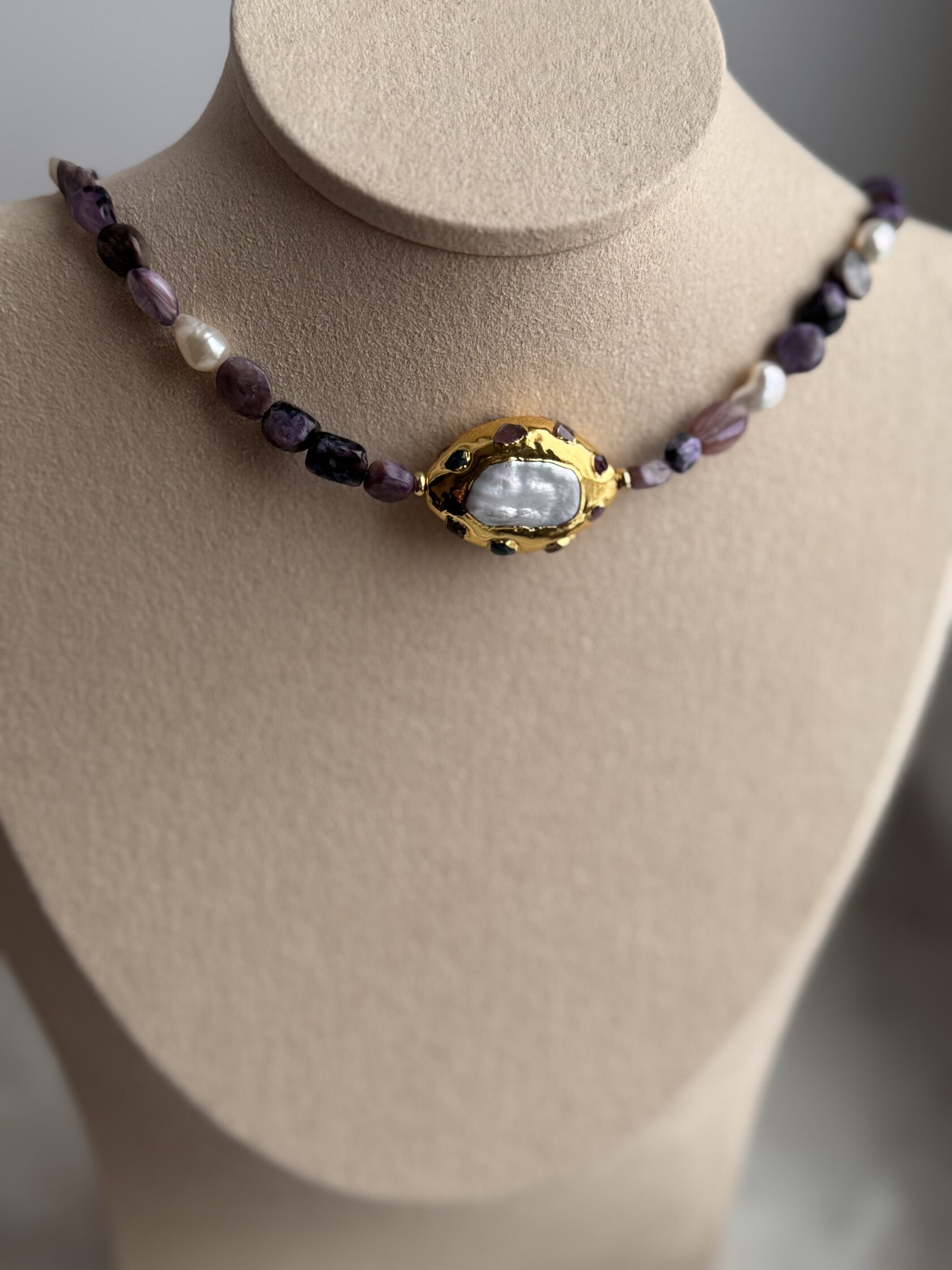 Двусторонняя бусина с натуральным белым и черным жемчугом в сочетании с жемчугом и турмалином свободной формы, повторяющим форму и цвет жемуга в бусине.