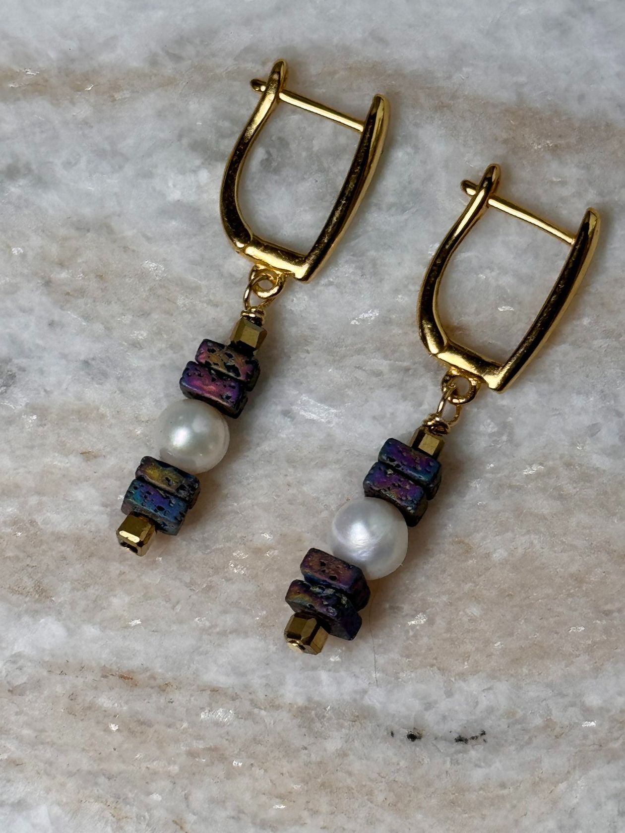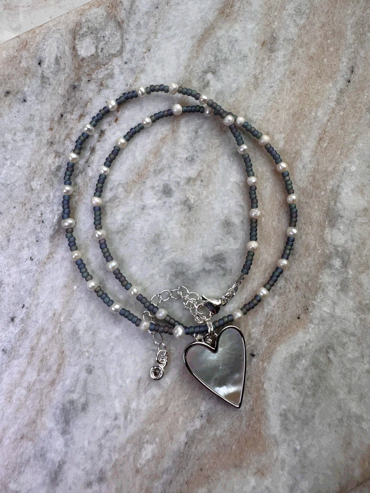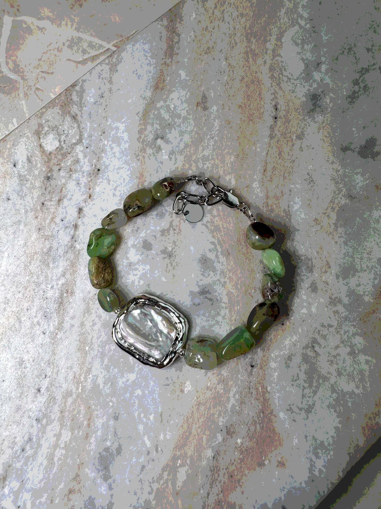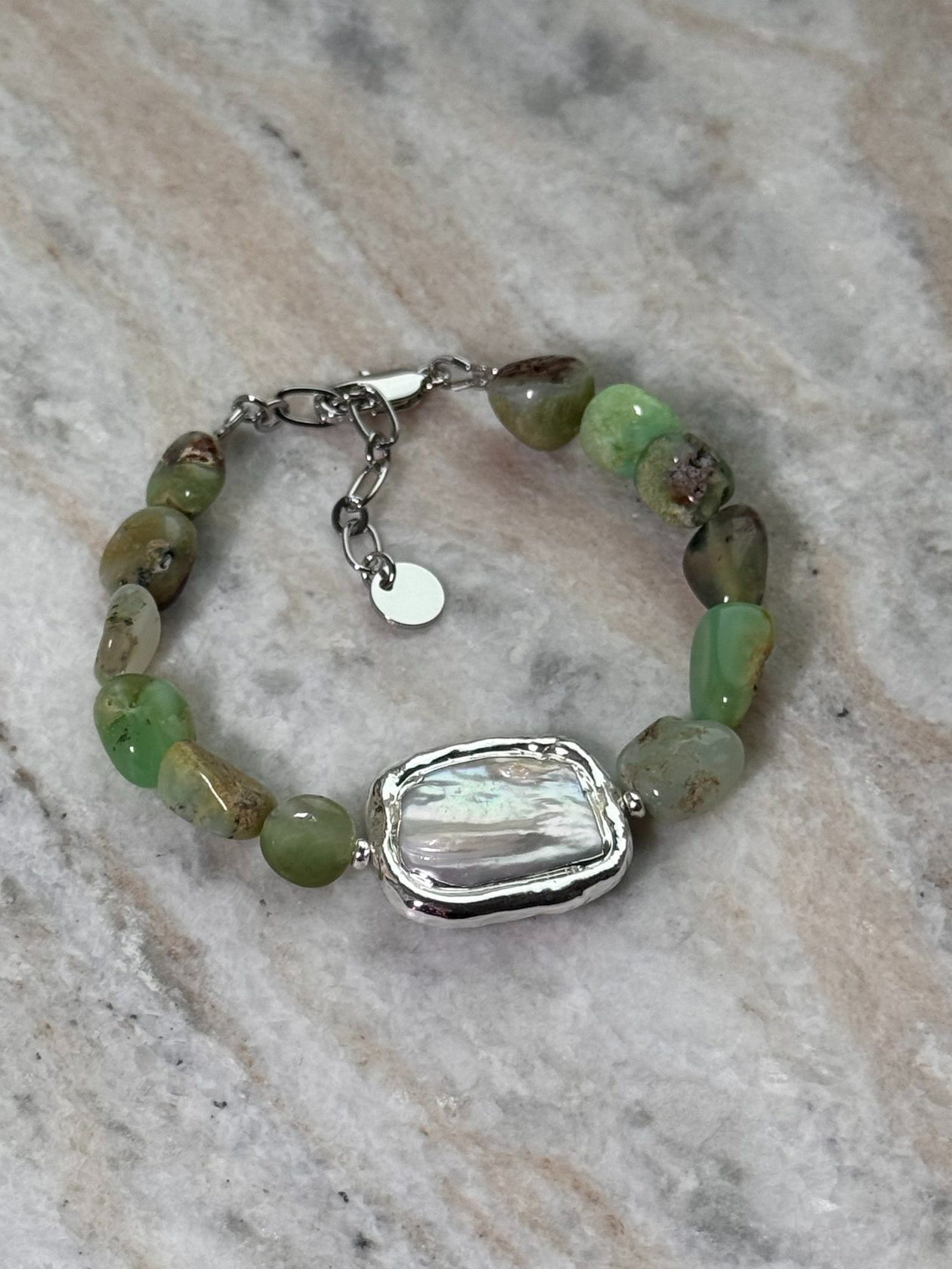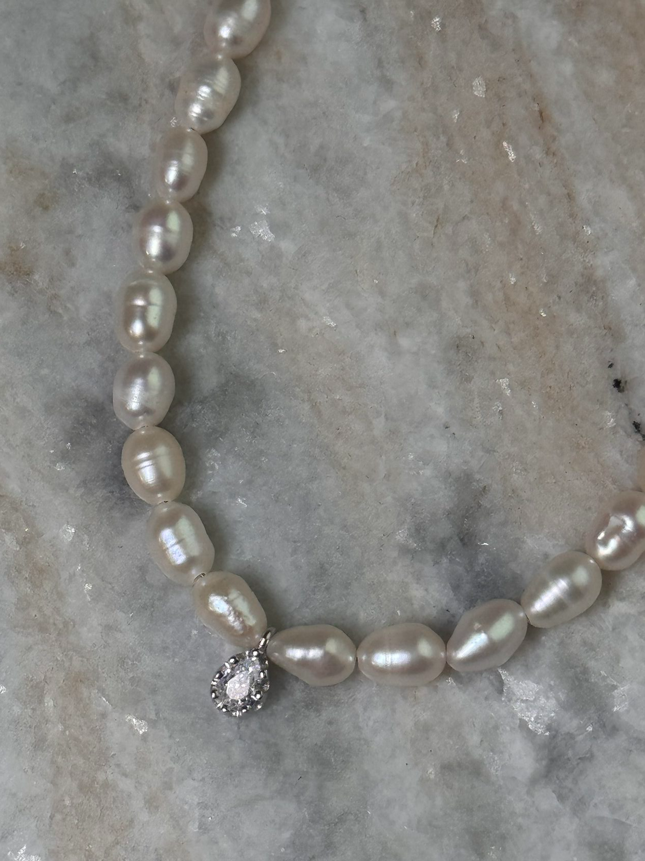 Двусторонняя бусина с натуральным белым и черным жемчугом в сочетании с жемчугом и турмалином свободной формы, повторяющим форму и цвет жемуга в бусине.