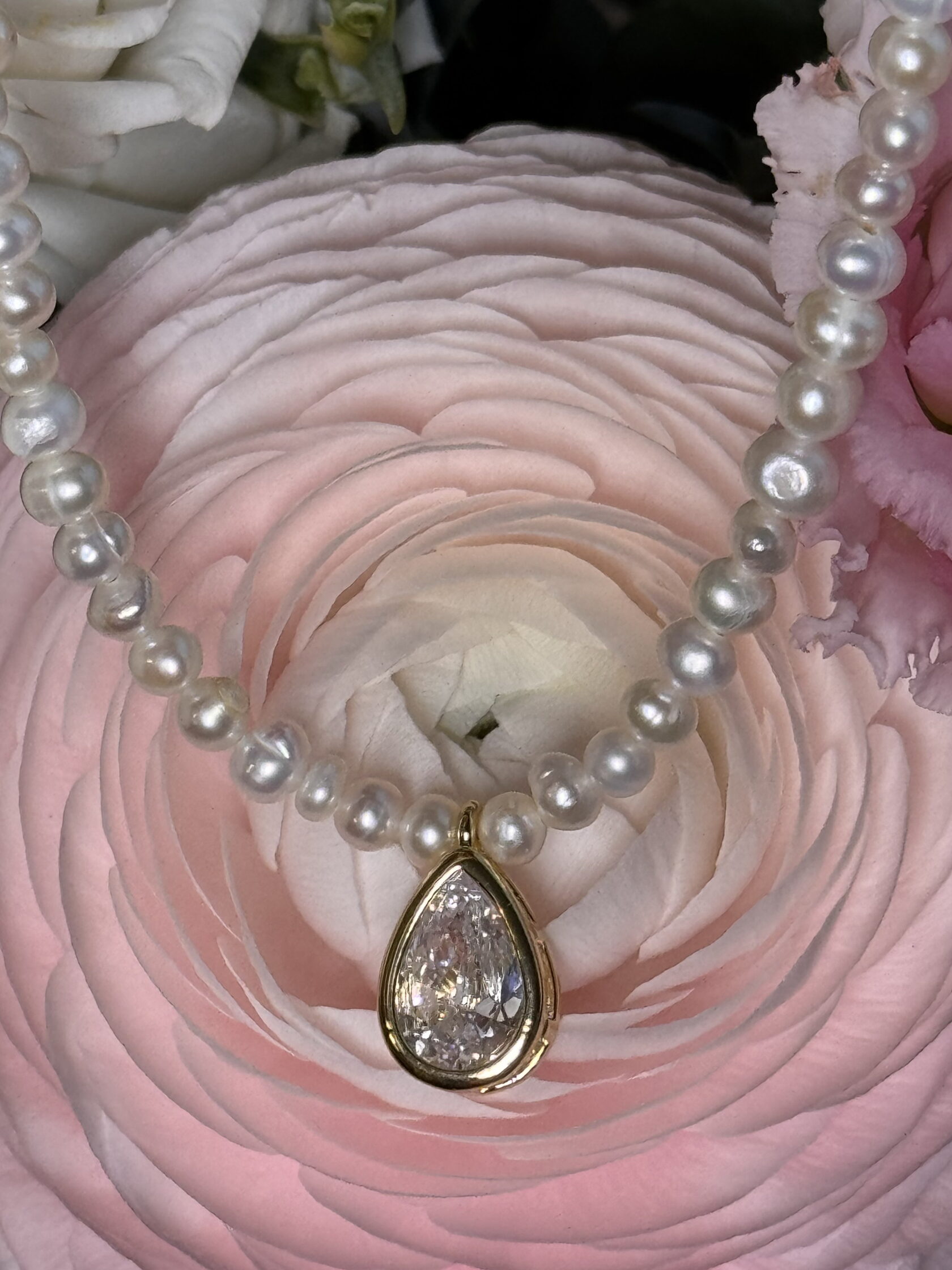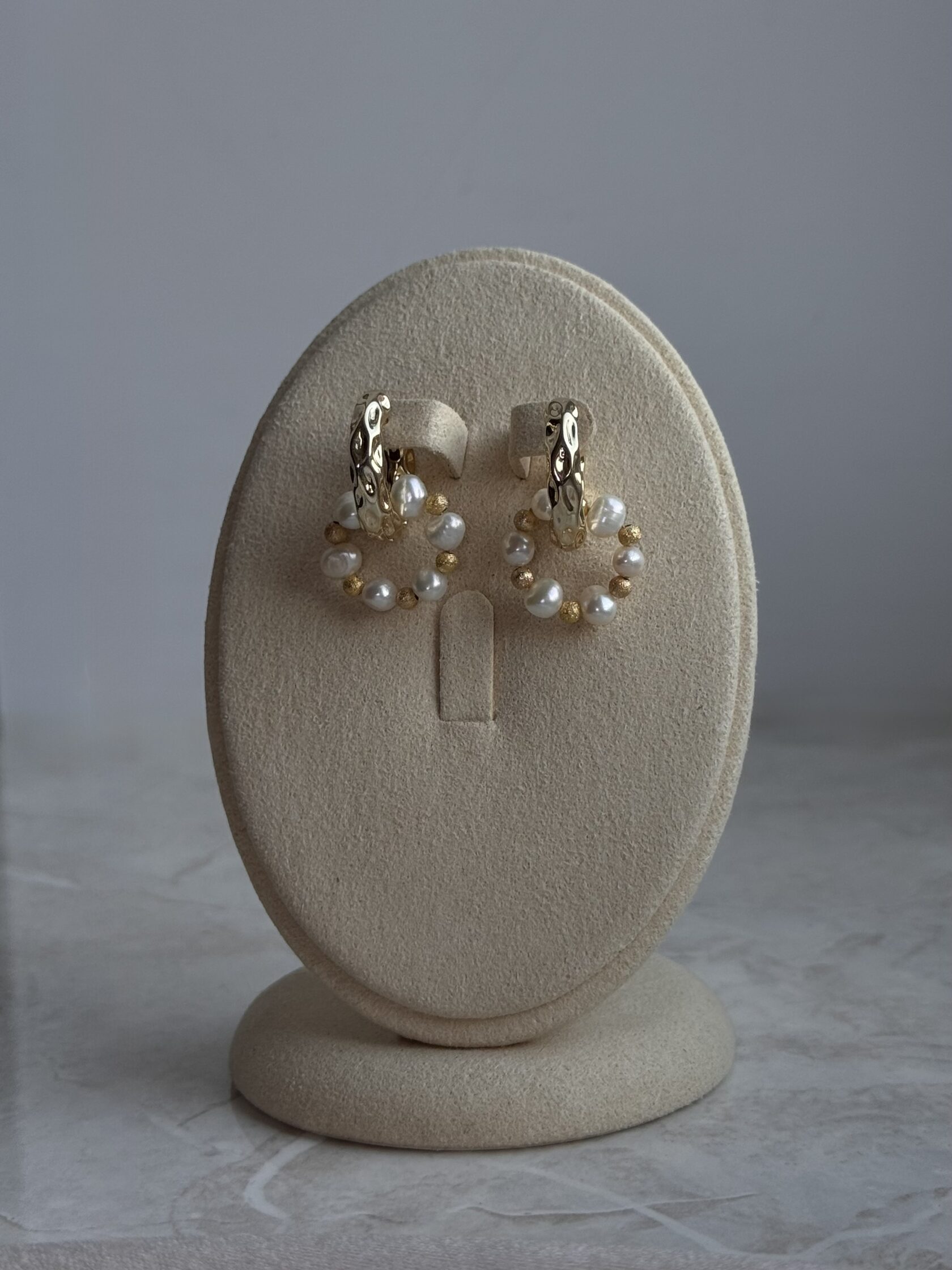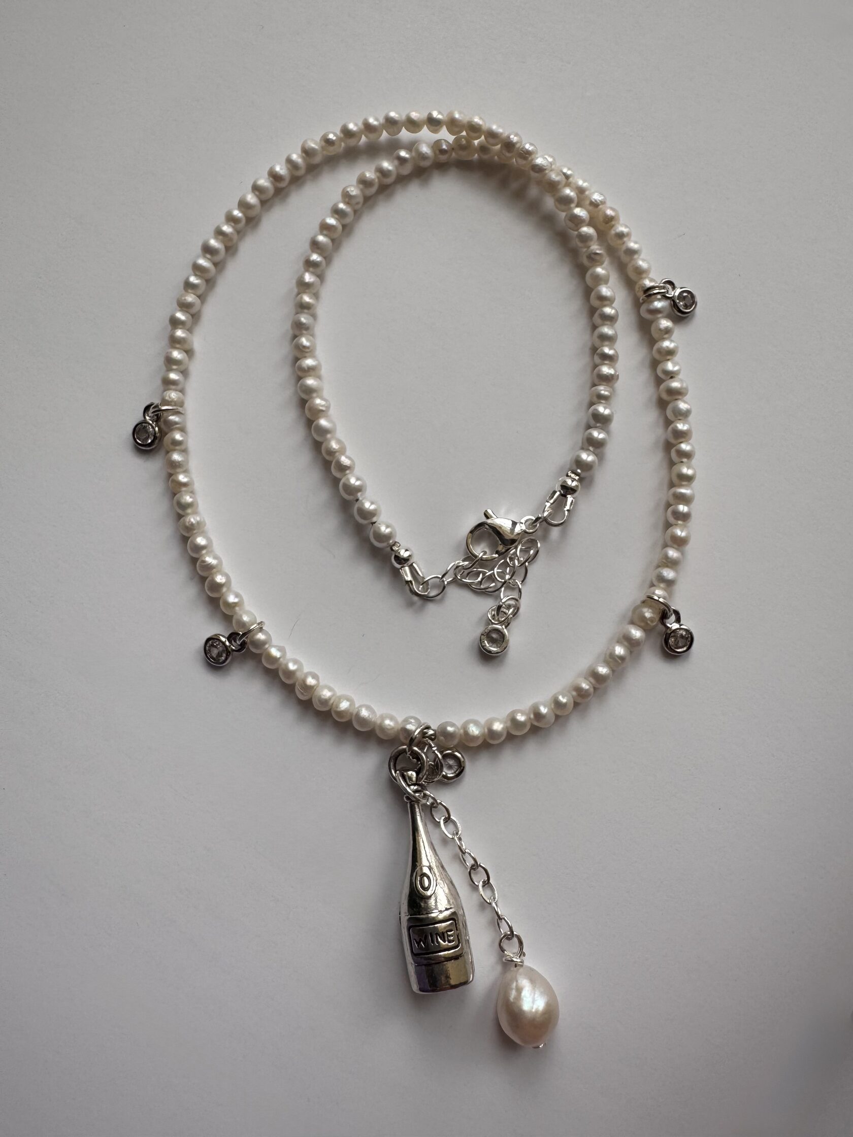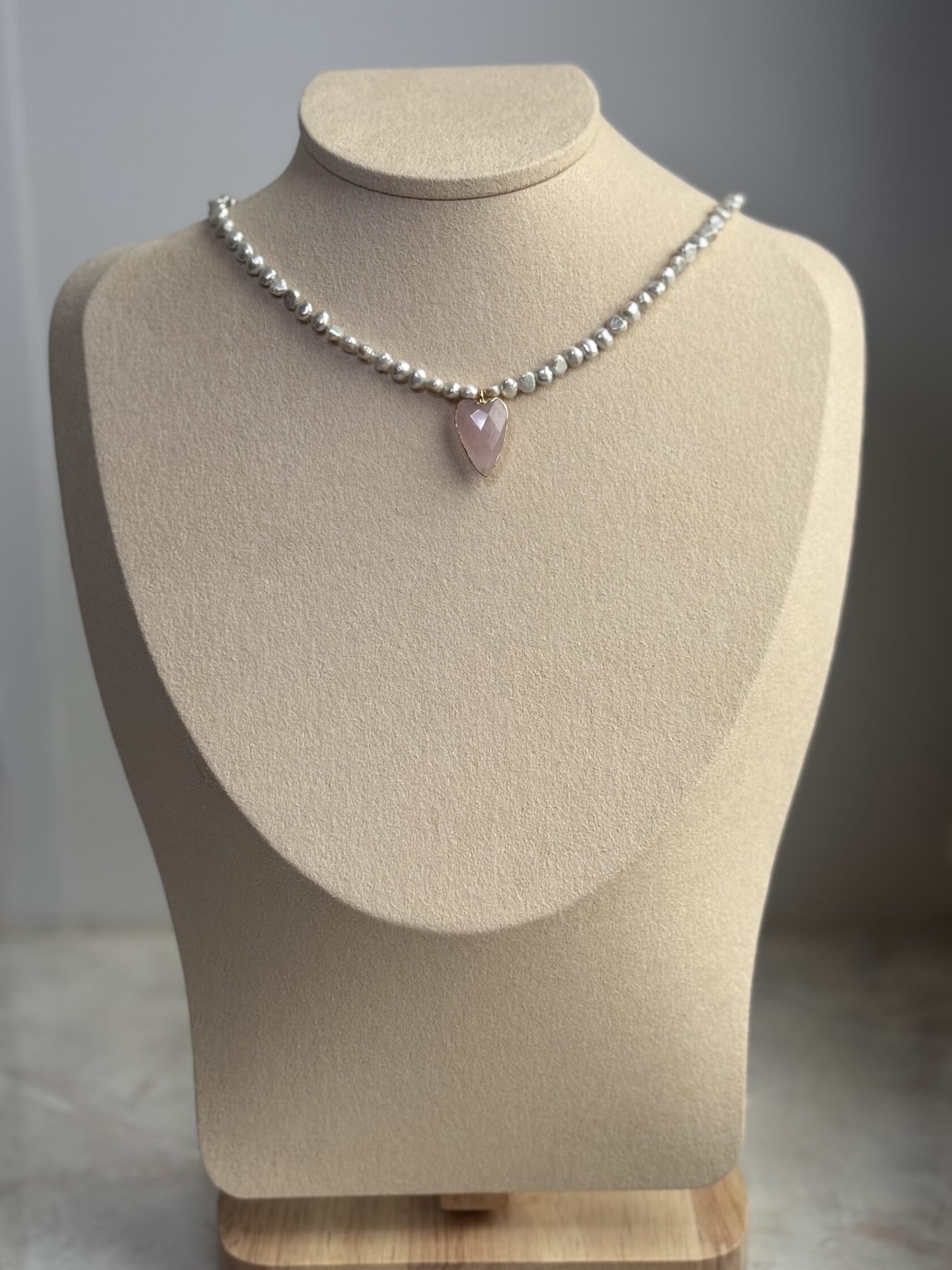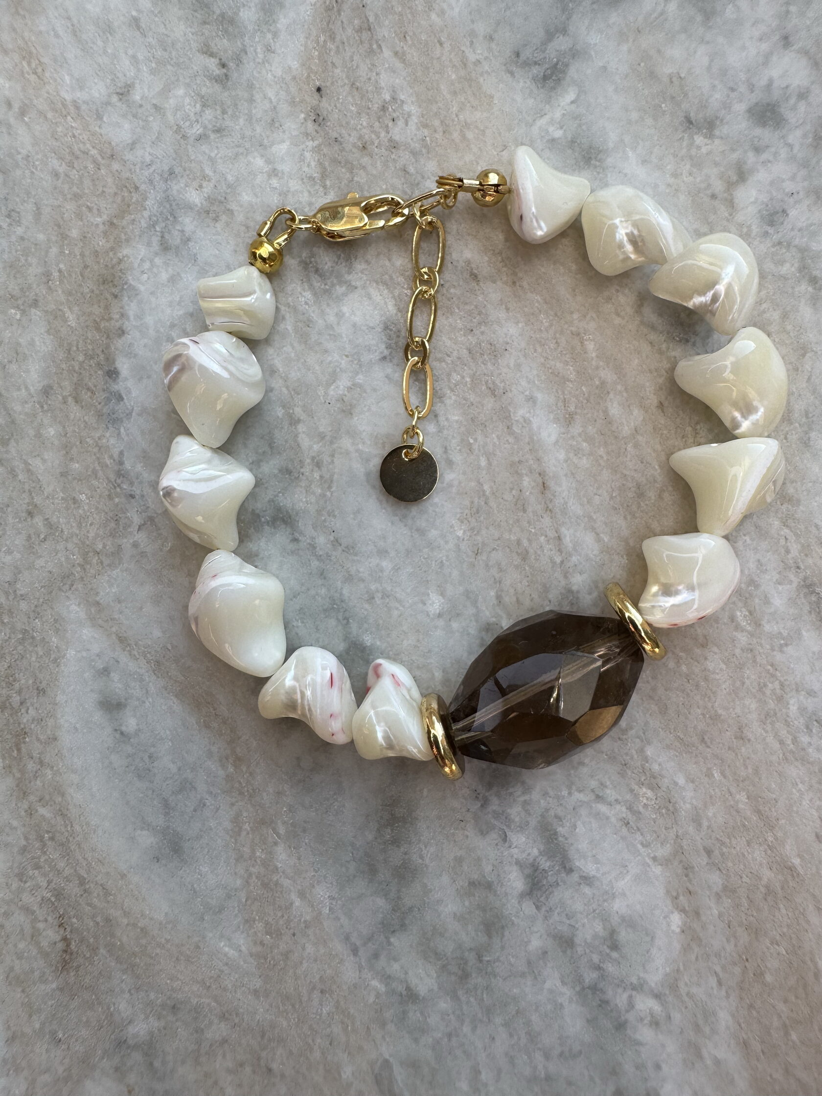 Двусторонняя бусина с натуральным белым и черным жемчугом в сочетании с жемчугом и турмалином свободной формы, повторяющим форму и цвет жемуга в бусине.